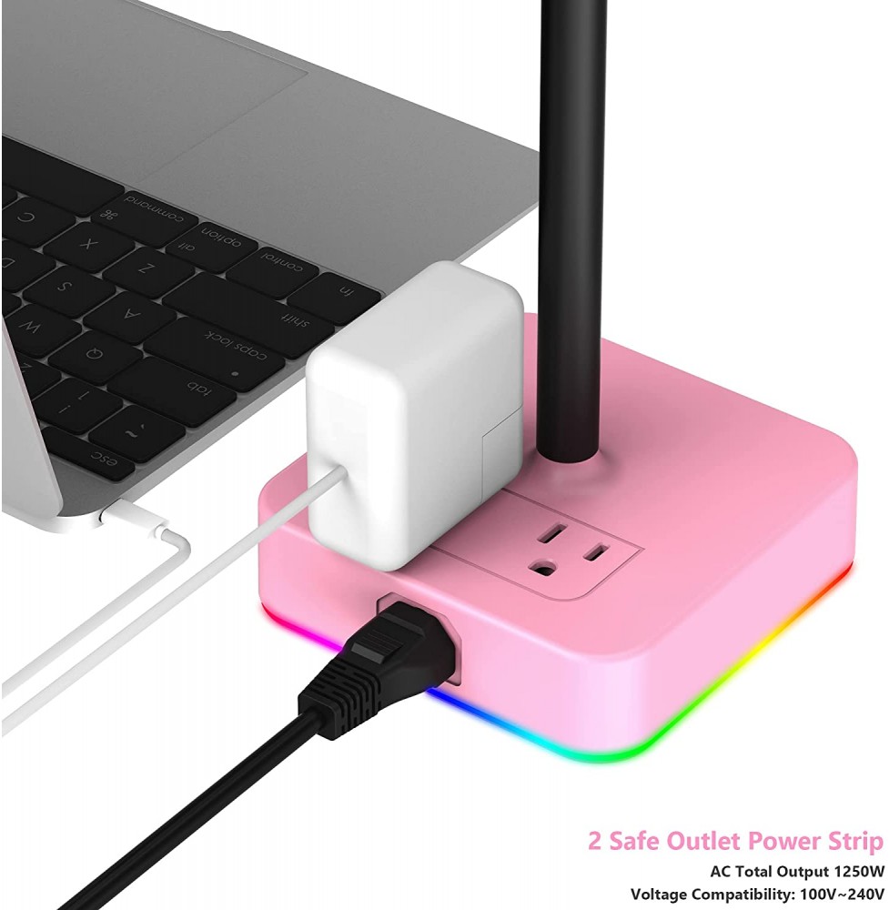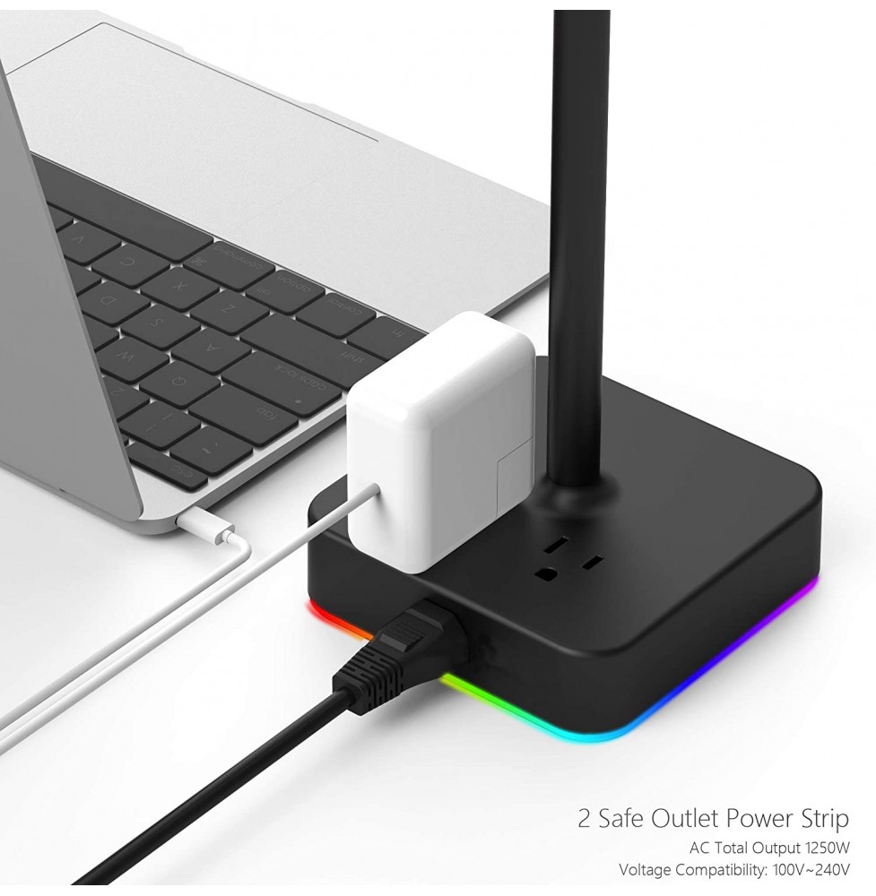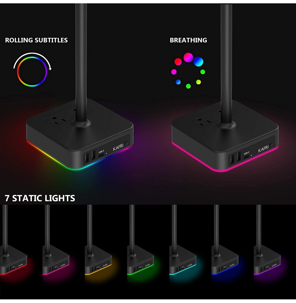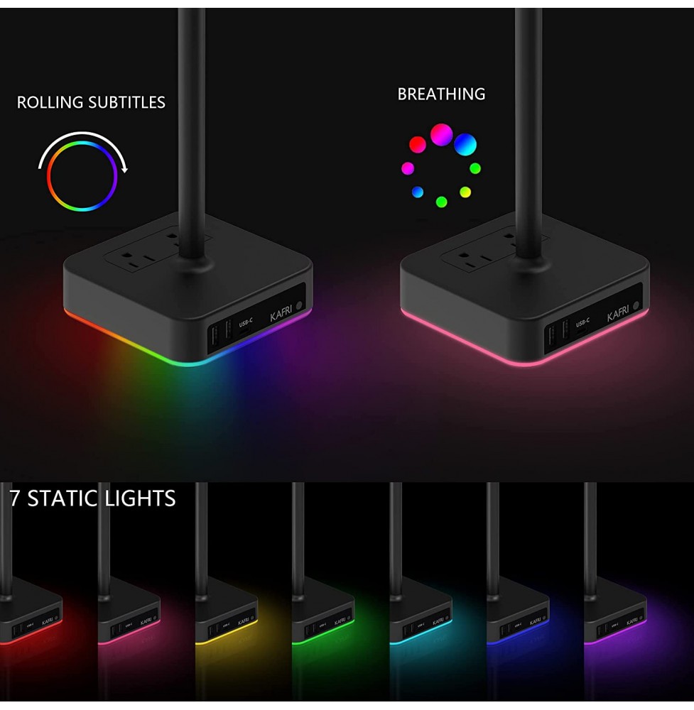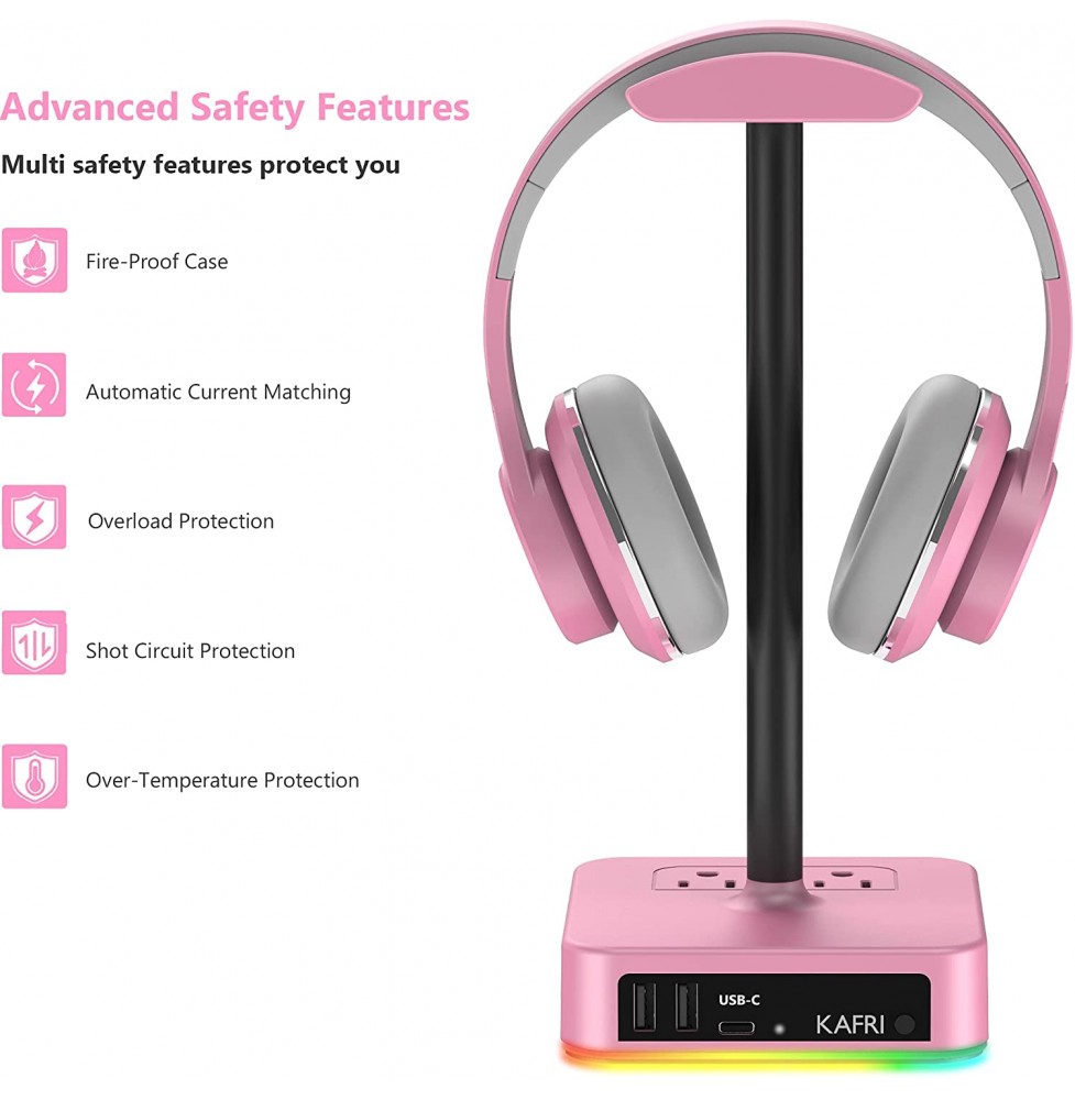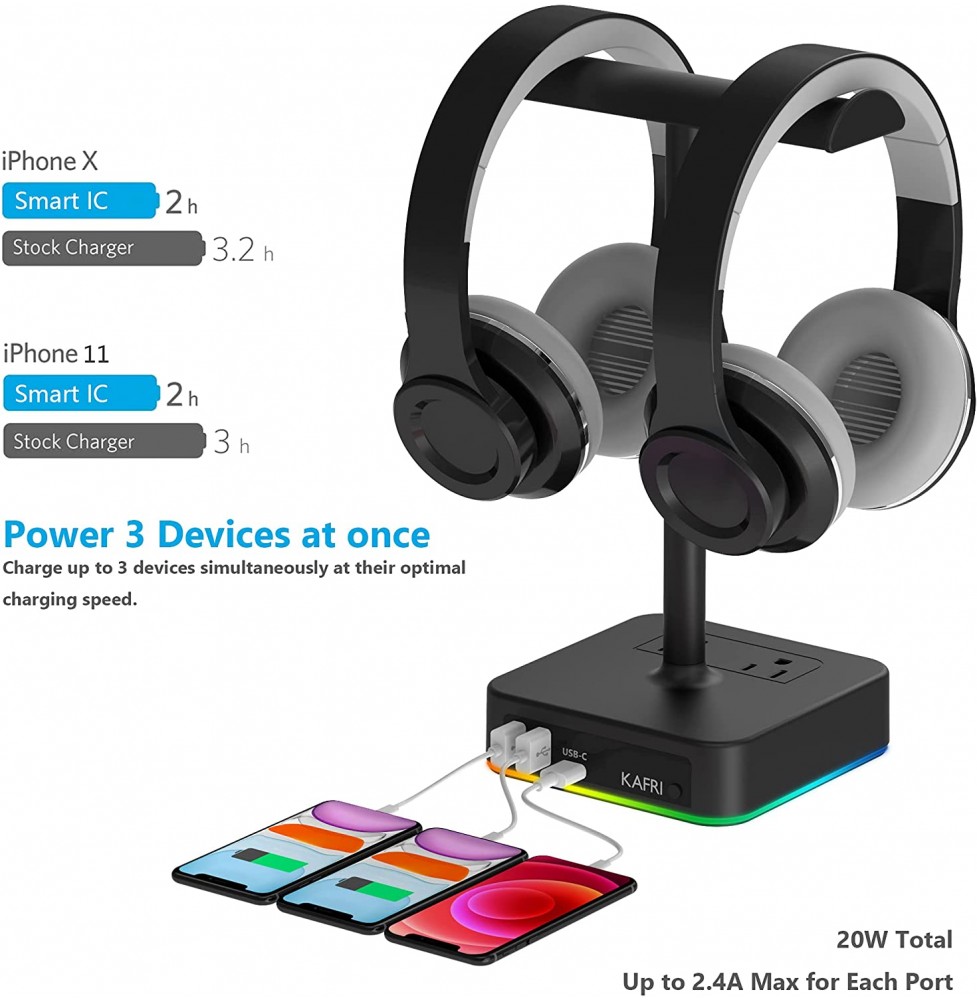 KAFRI RGB Headphone Stand with USB Charger Desk Gaming Headset Holder Hanger Rack with 3 USB Charging Port and 2 Outlet - Suitable for Gamer Desktop Table Game Earphone Accessories Boyfriend Gift